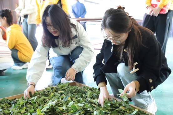 驻村干部李攀带领学院师生深入茶叶工厂生产一线体验参观,不少学院师生在茶叶厂工作人员的指导下围绕茶叶揉捻机上手实践。鲜活、生动的实践不仅让学院师生了解了金银花茶的制作过程,更让大家了解到闫家村村民的脱贫致富路。