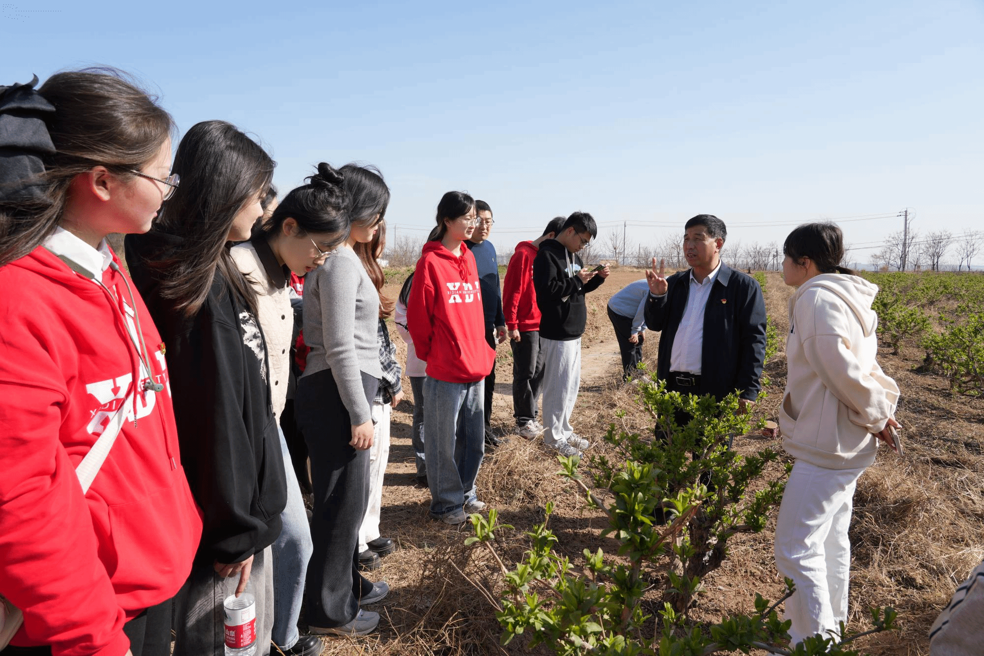 纸上得来终觉浅,绝知此事要躬行。时值春分,金银花树正发芽冒绿,闫家村田间地头一片生机盎然。参观完产业园区并了解闫家村金银花产业发展脉络后,学院师生跟随王书记来到金银花种植基地,走进种植金银花的田间地头,观察金银花生长情况,感受“金银”魅力。虽然此时金银花尚未开放,但在阳光的照耀下,金银花的嫩叶泛着翠绿的光泽,仿佛在诉说着春天的故事。学院师生们围在王书记的周围,听他讲解金银花的种植技巧、生长习性以及市场价值。师生们仔细观察金银花的生长情况,询问种植过程中遇到的问题和解决方法,王书记一一解答。“金银花开幸福来”,从王书记和村民们洋溢着笑容的脸上,我们看到了闫家村的未来就如同这金银花树一样充满着无限希望。
