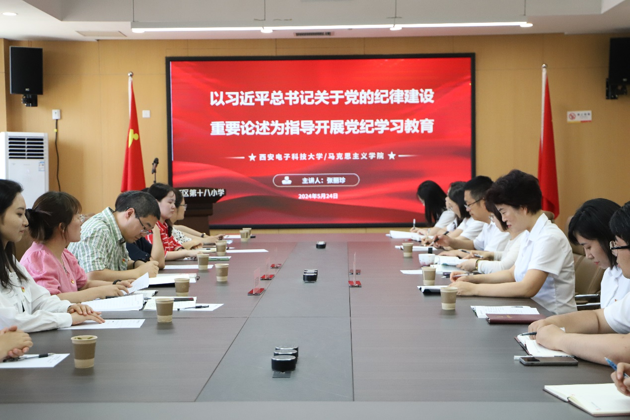 (通讯员 刘江)为深入学习贯彻习近平总书记关于党纪学习教育的重要讲话和指示精神,认真学习贯彻《中国共产党纪律处分条例》,进一步推进党纪学习教育工作走深走实,5月24日下午,yl6809永利习概教研室党支部与高新区第十八小学党支部联合开展“共上一堂党纪学习教育专题党课”活动。高新区第十八小学党支部书记史晶、委员杜英齐,西电马院习概教研室党支部书记张丽珍等共20名余人共同参加了活动。活动由高新区第十八小学副校长杜英齐主持。