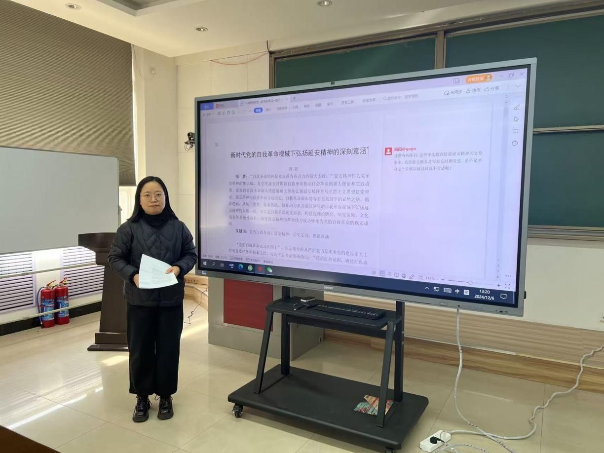 随后,曹阳老师围绕“新时代党的自我革命视域下弘扬延安精神的深刻意涵”主题,分享了近期的学术探索并表达了学术困惑。支部成员们从论文题目的表述、文章结构的逻辑、选题立意的目的、学术文献的引用等方面进行了深入交流,对所有教师都有重要启发意义,对于支部如何进一步研究好、阐释好党的创新理论进行了有益的探索。
