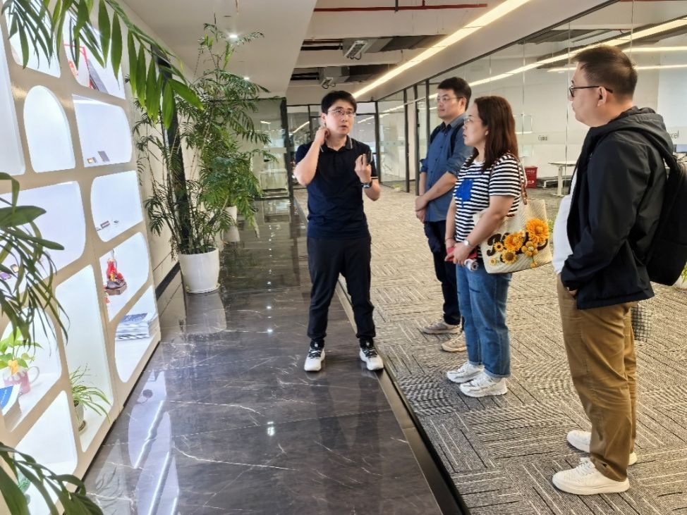 在参观中,地芯引力科技有限公司对外事务总监邹庆带领调研组一行参观了研发中心、实验测试中心和企业展厅,就企业发展历程、技术研发、发展前景和未来规划等方面对公司作了详细介绍。调研组一行深入了解了公司的产品情况,现场试用了部分互动产品,并与邹庆总监就该公司与西电杭研院共建实验室、积极探索技术成果转化以及人才培养等方面的合作情况进行了重点交流。