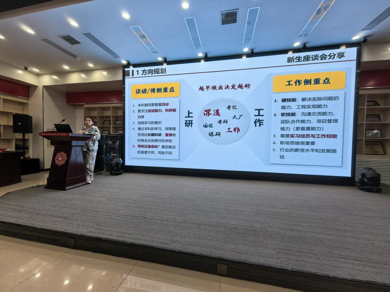 互动交流环节成为整场研讨会的高潮,现场氛围热烈融洽。新生朋友们踊跃发言,围绕 “专业课学习方法”“社团活动与学业的平衡”“网络安全专业就业前景”“保研流程与准备” 等问题积极提问。