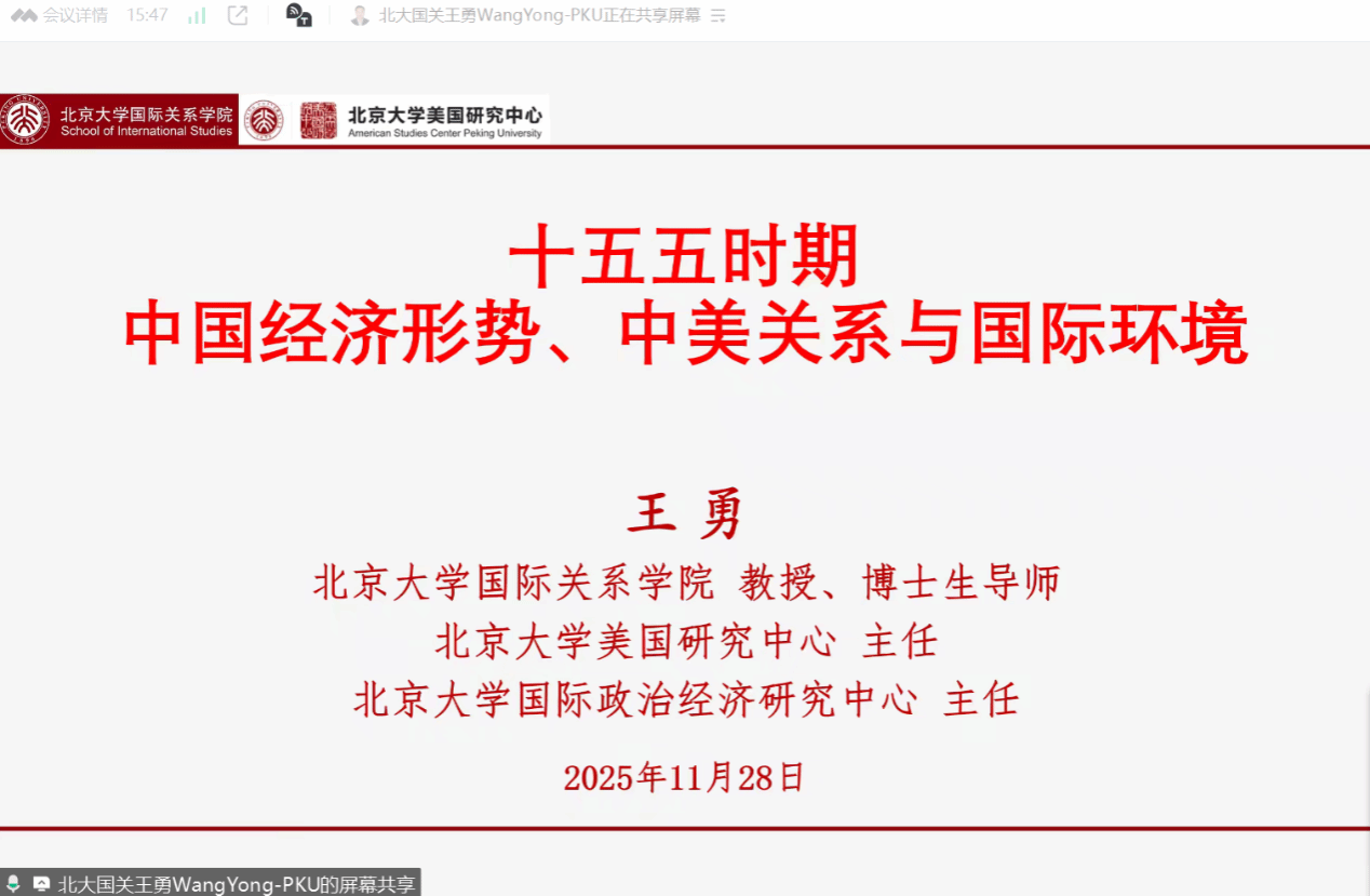 (通讯员 赵普兵)为深入学习贯彻党的二十届四中全会精神,扎实推进党的最新理论成果进课堂、进头脑,11月28日晚7点,“形势与政策”课程组采用线上形式召开秋季学期第二次集体备课会。此次集体备课会特邀北京大学国际关系学院王勇教授作题为《“十五五”时期中国经济形势、中美关系与国际环境》的辅导报告。本学期形势与政策课专兼职教师共50余人参加了备课会,形势与政策教研室主任程霞老师主持会议并作总结发言。
