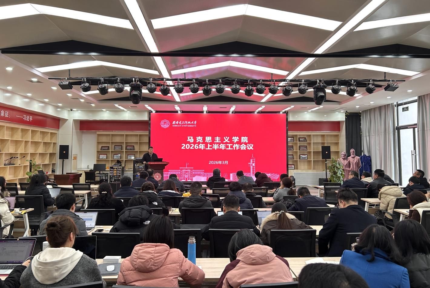 周燕来与全体教职工共同学习了习近平总书记在二十届中央纪委五次全会上的重要讲话和全会精神,并传达学校2026年工作会议要求。他强调,要以更高标准落实全面从严治党要求,扎紧制度笼子、强化权力监督,为学院“十五五”开局发展筑牢政治保障。要深化马克思主义理论学科与人工智能等学科交叉创新,做好学科前瞻性布局。同时,周燕来明确2026年学院核心工作,对树立和践行正确政绩观学习教育、做好巡察整改“后半篇文章”、深化教职工集中理论学习、开展特色党建活动等工作提出具体要求。他指出,要深刻认识意识形态工作、师德师风建设的极端重要性,守牢底线、压实责任。