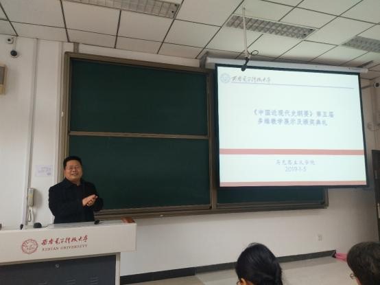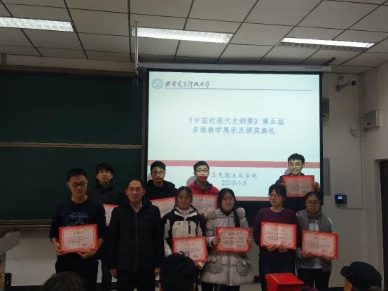 (通讯员禹海霞 刘晓红)2019年1月5日下午,第五届“纲要”课多维教学成果展示暨颁奖活动在信远楼1区106、108、110教室举行。本次活动由中国近现代史纲要教研室组织,教研室主任刘晓红主持,教研室全体教师参加。yl6809永利院长李刚、学院党委书记夏永林、副院长贾钢涛出席活动并为获奖同学颁奖。