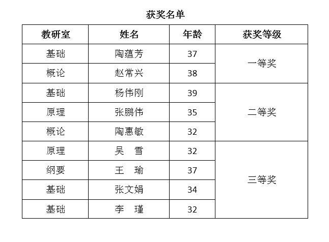 各位评委从教学设计、教学内容、教学方法、教学效果、教师素养等方面对参赛教师进行打分和点评,并提出建设性的意见和建议。戎毓春宣布比赛结果。本次比赛评出一等奖2人、二等奖3名、三等奖4名,并推荐35岁以下青年教师张鹏伟、陶惠敏参加学校青年教师讲课比赛。