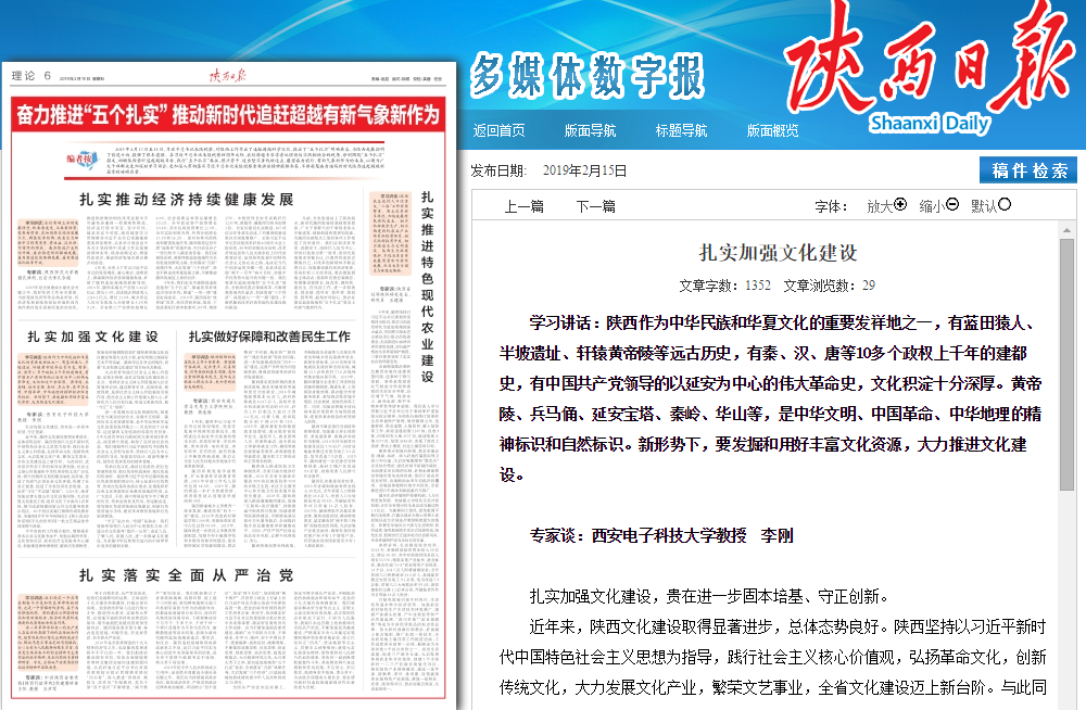 (通讯员 刘朔)2月15日,《陕西日报》理论版刊登了yl6809永利院长李刚教授的文章《扎实加强文化建设》。文章强调,在新形势下要固本培基、守正创新,立足陕西文化建设的总体态势,弘扬好主旋律、找准历史文化资源优势与现代的结合点、激活红色基因,向强省迈进。