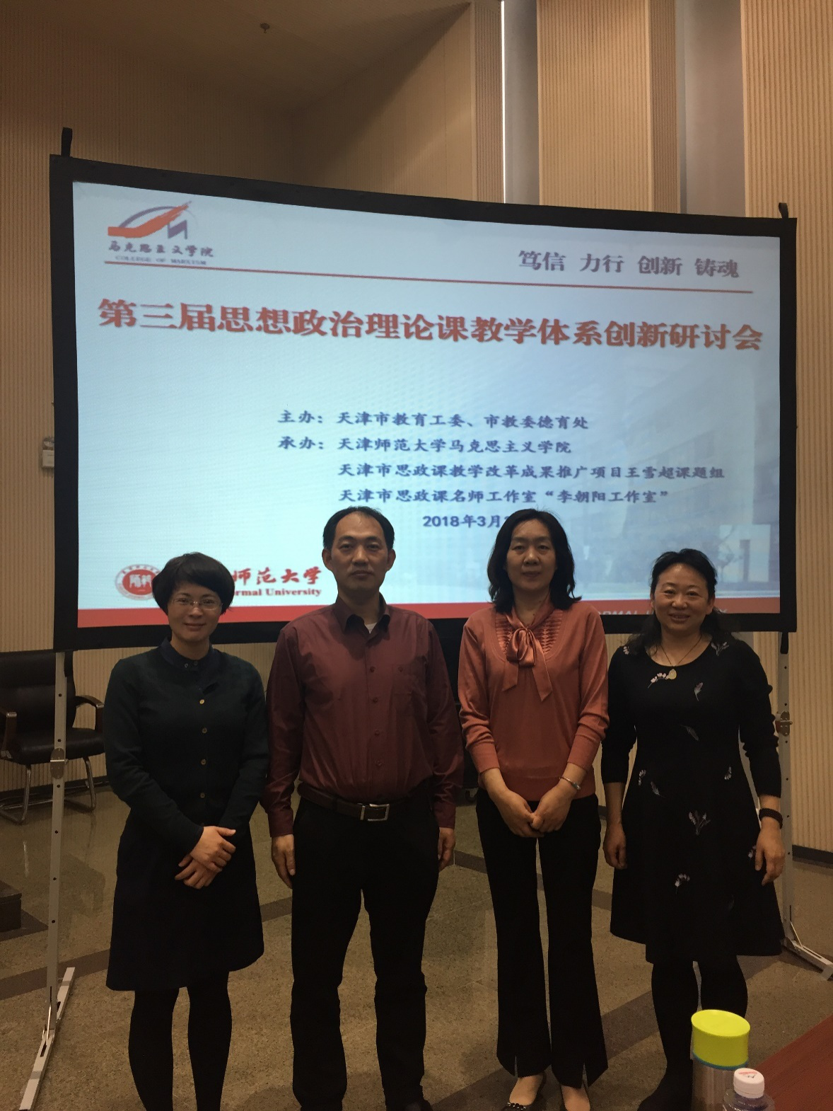 (通讯员刘晓红)为深入学习和贯彻落实党的十九大精神和教育部“高校思政课教师队伍建设”活动要求,全面提升纲要课教师团队教学水平,纲要教研室的任芳老师、贾钢涛老师、刘晓红老师、罗淑宇老师在学院领导的大力支持下,于3月30日至4月1日,赴天津师范大学参加“第三届思政课教学体系创新研讨会”。与会期间,大家深感收获颇丰。一致认为不仅近距离学习了兄弟院校的宝贵经验,拓展了教学研究视野,为推进我校纲要课教学研究提供了思路,同时加强了联系,扩大了我校yl6809永利的影响。