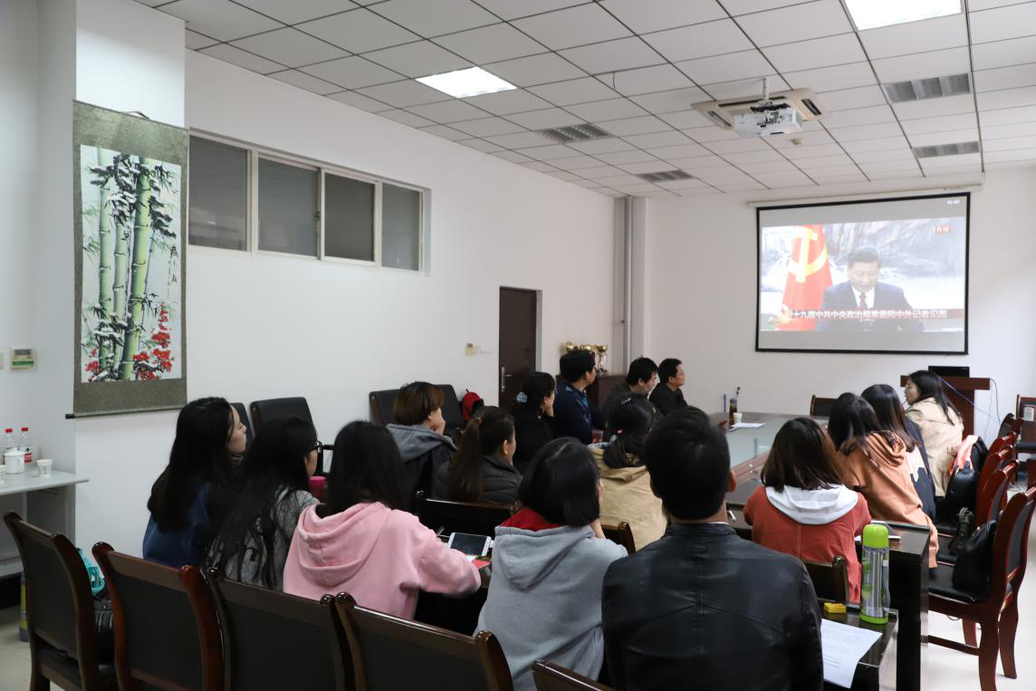 (通讯员:谢肖)2017年10月25日(星期三)上午11时45分许,新一届中共中央政治局常委在人民大会堂一楼东大厅同中外记者见面。中国共产党第十九届一中全会选举习近平、李克强、栗战书、汪洋、王沪宁、赵乐际、韩正为中央政治局常委。yl6809永利临时党委组织学院师生在信远二区135会议室集中收看现场直播盛况,临时党委书记夏永林主持了现场收看活动。