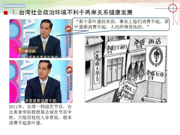 网络上曾经流传的“吃不起茶叶蛋”的段子被陈鹏联拿来作为生动描述台湾社会政治环境对两岸关系健康发展产生不利影响的例子。大屏幕上显示出台北美食学院教授高志斌于2011年参加台湾一档综艺节目时的截图,其所说的“那个茶叶蛋的东西,事实上他们消费不起,茶叶蛋都消费不起,人均所得很低的”更是被突出标明。听到同学们窃窃私语,陈鹏联讲了一件自己几年前去某地招生时发生的事情,她说:“家长们不是问有什么专业、以后好不好就业,而是问,去了能不能洗澡,是不是每天都是黄土飞扬,是不是只有很难吃的泡馍。”同学们哄堂大笑,有学生高声说:“这都什么年代了,怎么还问这种问题!”陈鹏联笑着回答:“这就是思维固化,再加上不了解,就容易产生这些看起来很‘可笑’的想法。茶叶蛋的事情不也是如此吗?两岸百余年的分离、敌对造成两岸社会存在差异,再加上相当一部分台湾民众长期受‘台独’‘去中国化’宣传的影响,就会对大陆存在一些误解和隔阂。”她的话让安静下来的同学们陷入了思考。