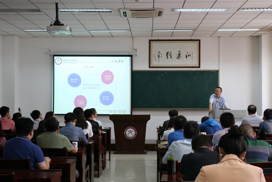 漆 思院长重点介绍学院十三五发展规划和“三个一流”建设情况。漆思总结了人文学院十二五期间取得的成绩的同时,指出了存在的问题和不足,重点就十三五期间人 文学院如何实现跨越式发展,能否实现“弯道超车”,同在座的教职工作了深入交流。他表示,新的人文学院是一支有能力、能干事、干成事的队伍,希望全体教职 员工不忘初心,凝心聚力,在大家的共同努力下,争取在十三五期间,学院各项工作实现质的飞越,将人文学院建设成为研究型为主的学院。学科建设方面,成功申 报一级学科博士点,完善学科布局。科学研究方面,全体教师潜心学术研究,多读书打好基础,在高层次学术期刊发出自己的声音,在国家社科基金重大和重点项目 申报上取得新突破,人均科研体量达到校内一流水平。师资队伍方面,继续大力引进优秀博士和高端人才,同时培育现有教师,在教育部长江学者、万人计划、陕西 省百人计划等人才领域实现新增长,争取部分学者教师在国内学界和同行中具有一定影响力。人才培养方面,建设好人文科学综合实验班,将哲学、汉语言文学和录 音艺术三个专业打通培养,探索创新人才培养模式,继续做好终南文化书院文化育人工作。