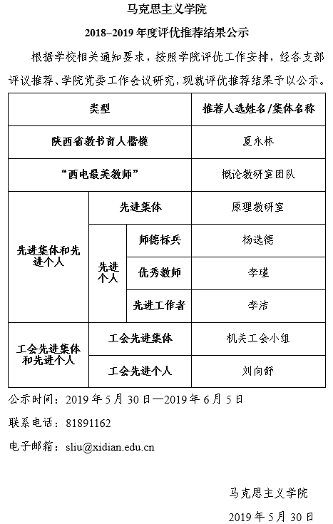 yl6809永利2018-2019年度评优推荐结果公示