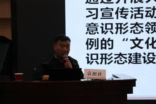 袁祖社做了题为《习近平新时代意识形态重要讲话精神解读》的专题报告。他指出,意识形态工作具有高度的方向性、系统性、根本性、战略性、全局性特点,同时又具有隐蔽性、动态性、敏感性、颠覆性特。面向新发展阶段,全面、深刻理解习近平意识形态领域重要思想论述,要掌握以下几个方面重要内容:一是意识形态工作如何使新时代党的创新理论更好入脑入心,就是“举旗帜”的问题;二是如何更好把握“最大的政治”、做好这个“最大的政治”,就是“聚民心”的问题;三是如何进一步巩固马克思主义在意识形态领域的指导地位,就是“育新人”的问题;四是如何更好繁荣发展文化事业和文化产业,提高国家文化软实力,推进社会主义文化强国建设,就是“兴文化”的问题;五是如何把我们的价值理念、制度优势、发展故事等讲出去,赢得更广泛的接受和认同,创造更好的外部环境,就是“展形象”的问题。他强调,“意识形态”领域向来是“没有硝烟的战场”,面对西方意识形态的渗透,要牢牢把握意识形态的领导权,敢于“发声亮剑”。