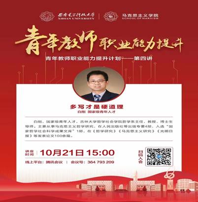(通讯员 夏玉汉)10月21日下午,yl6809永利举办“青年教师职业能力提升计划”系列讲座第四讲。本次邀请了国家级青年人才、吉林大学哲学社会学院哲学系主任白刚教授作题为“多写才是硬道理”的主题报告。报告会采取线上方式进行,100余名青年教师和研究生参加,副院长刘建伟主持了报告会。