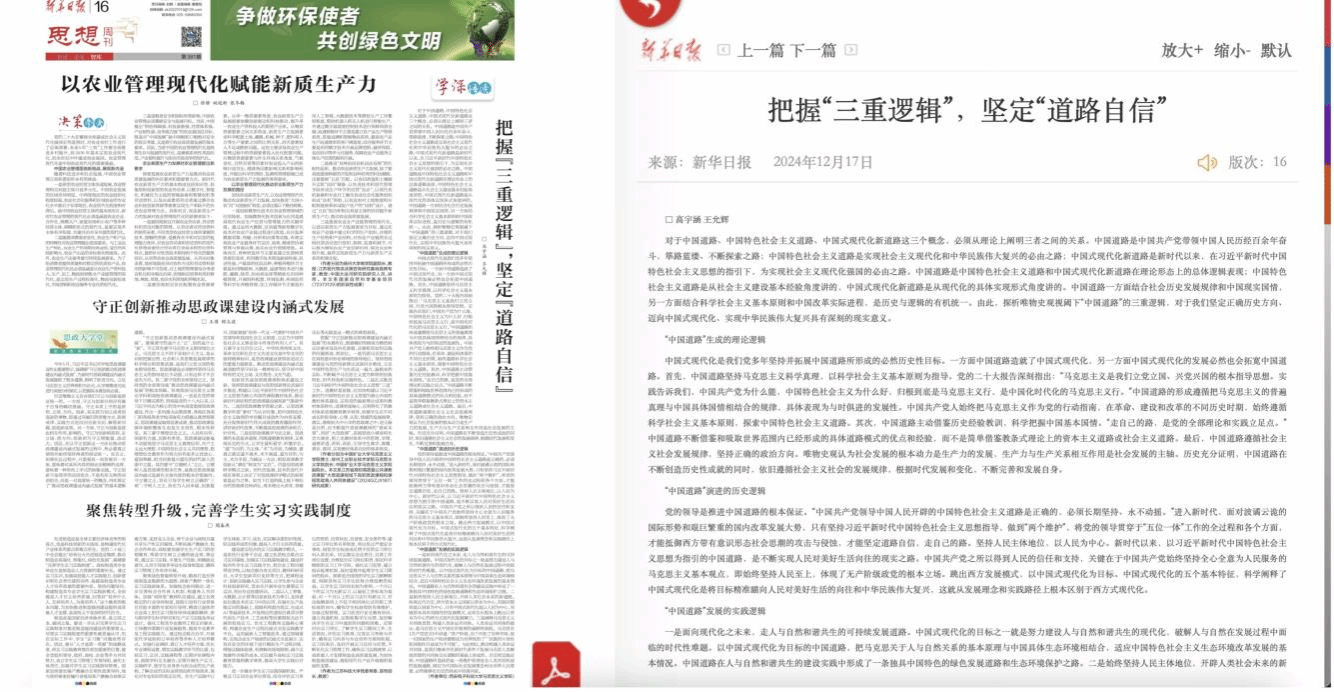 (通讯员 张瑾)今日,yl6809永利2023级研究生高宇涵、王允辉在《新华日报》第16版发表论文《把握“三重逻辑”坚定“道路自信”》。文章围绕“中国道路”与中国式现代化这一热点论题,探索了“中国道路”不断发展的时代意义。文章指出:自党的二十大提出中国式现代化这一重要命题以来,无论在理论还是实践中都确证了中国特色社会主义道路的科学性和前瞻性。中国特色社会主义道路对中国式现代化具有深刻的理论和现实意义,具体来说“中国道路”是一条中国共产党带领中国人民为实现不同阶段目标、走向现代化之路,是实现中国式现代化的必由之路。探究唯物史观视域下“中国道路”的历史必然性,对于在推进中国式现代化的进程中,坚持“走什么路,如何走,走向哪”具有深刻的历史和现实意蕴。历史维度上,有助于我们厘清中国道路生成的历史逻辑,更加坚定历史自信;现实维度上,对于回答好时代之问、走好中国式现代化道路、实现中华民族伟大复兴具有深刻的现实意义。