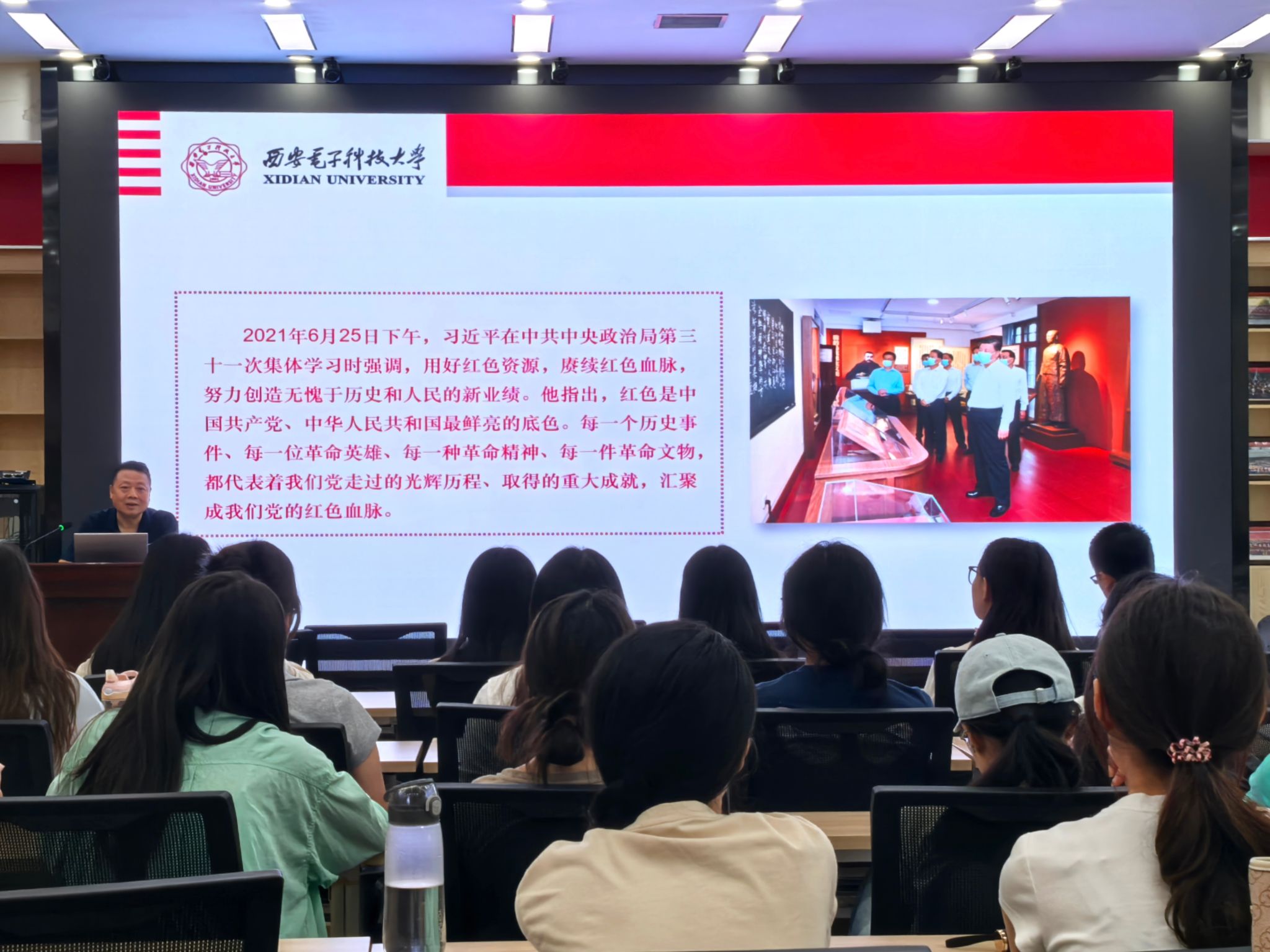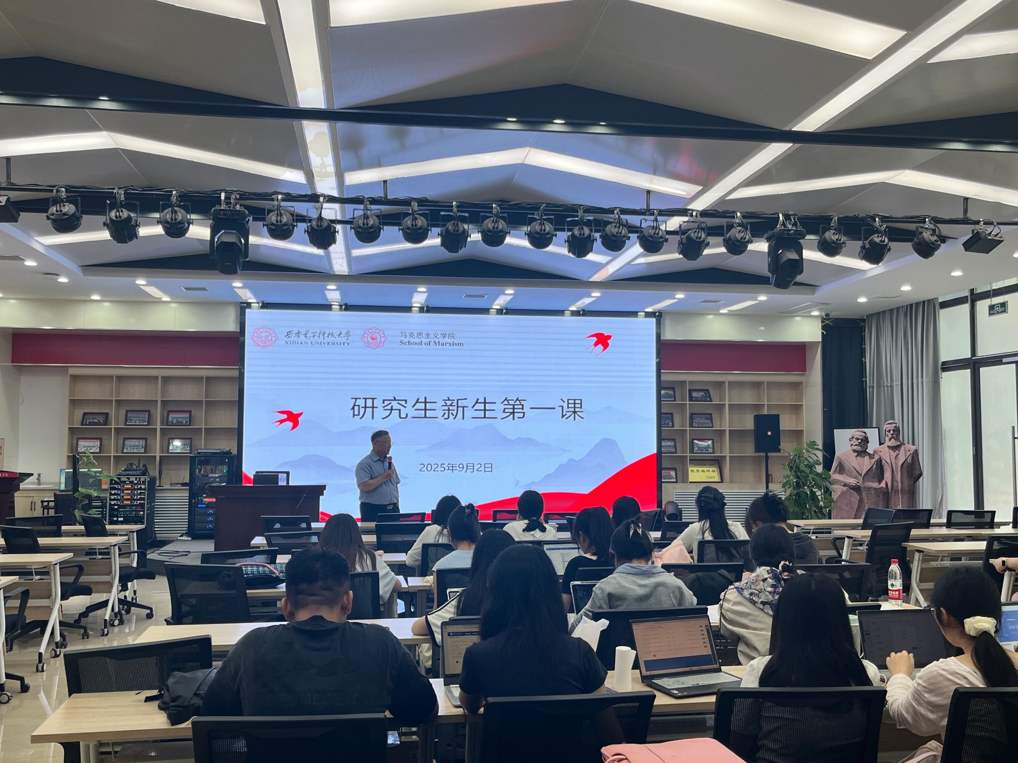 9月1日下午,yl6809永利党委书记周燕来教授以《鲜活的红色资源宝藏》为题,系统讲述了学校与学院的发展历程。首先,他阐述了“西电红”的深刻内涵——既象征着学校深厚的根脉传承,也始终是西电马院最鲜明的精神底色。其次,他以毛泽东主席为西电题写的“全心全意为人民服务”为核心,回顾了学校办学的光辉历程,强调“使命”是贯穿始终的精神主线。他指出,红色电波永不消逝,西电人始终听党话、跟党走,传承着忠诚可靠的政治本色。最后,他勉励同学们传承西电红色基因,勇担时代使命,在今后的学习与发展中紧跟时代、锤炼自我,为迎接国家未来发展的需要贡献青春力量。