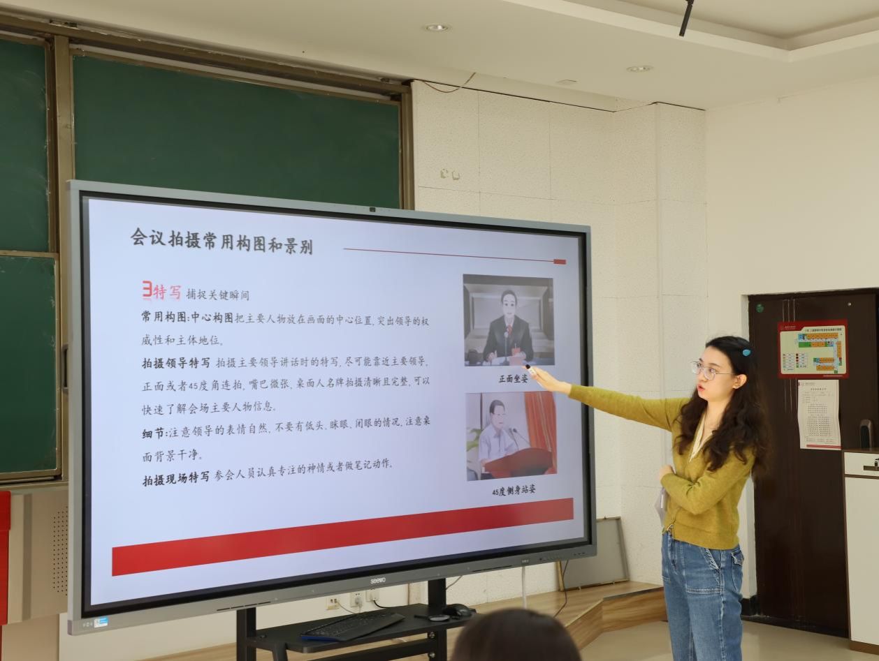 随后,侯坤晨老师以新闻摄影技能为核心展开分享,她围绕相机参数设置、构图法则、光线运用等核心知识进行了详细讲解,并结合不同新闻场景的特点,具体指导同学们捕捉活动中的“精彩瞬间”。