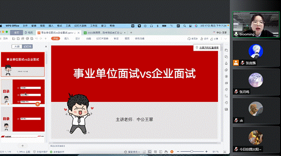 (通讯员:张垚强)3月17日,yl6809永利举办就业工作推进暨企事业单位面试技能培训会。在学校就业指导中心支持下,邀请中公教育面试辅导专家王翠老师线上为同学们进行面试流程技巧及重点难点解析。副院长王晋出席,学院2022届学生和部分2023届学生参加了会议。