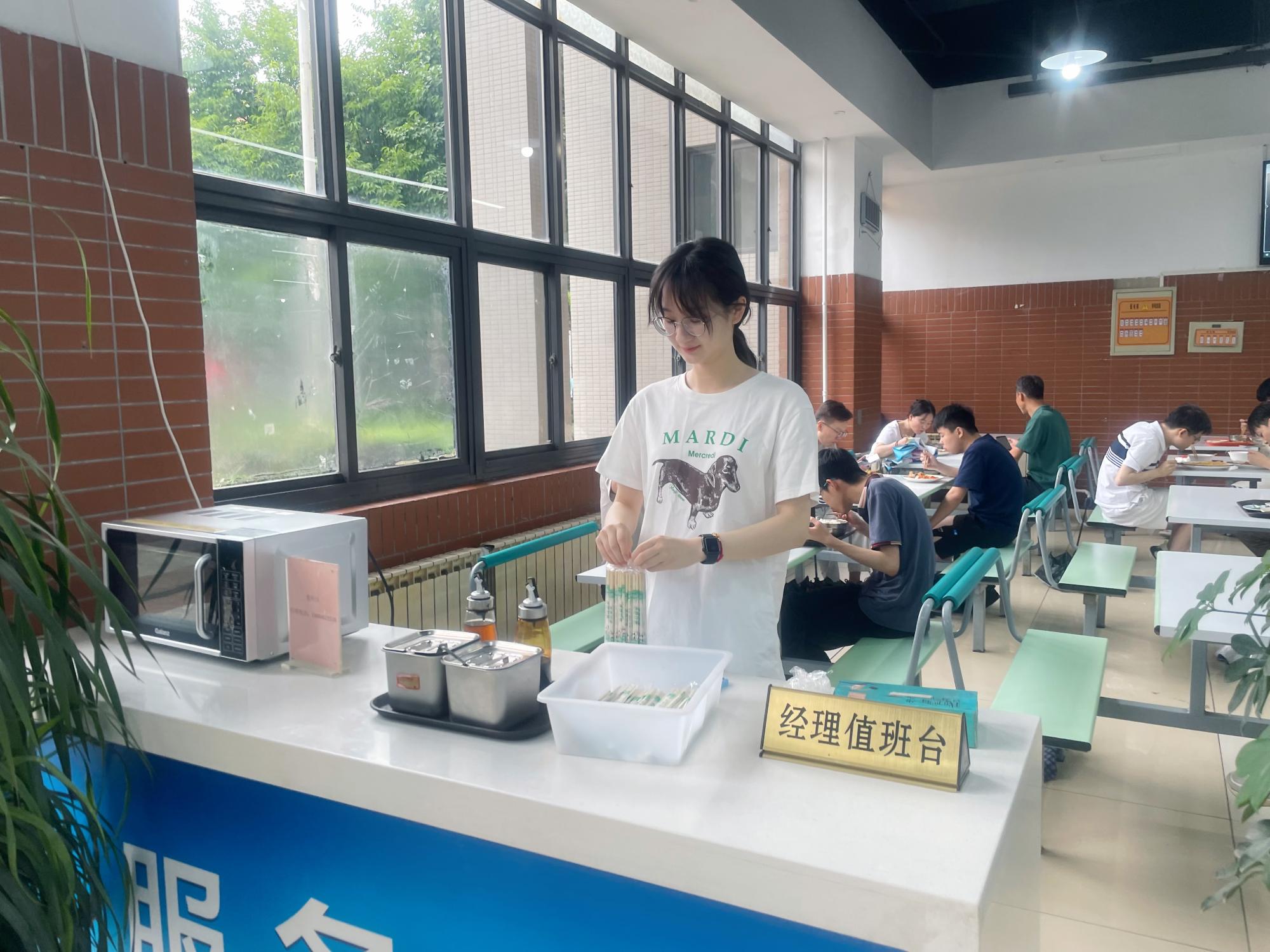 “一粥一饭,当思来处不易;半丝半缕,恒念物力维艰。”转至学生餐厅,服务台的文明餐厅监督员正在登记收集就餐人员关于餐厅的合理意见与建议;而在一元餐窗口,美好食光引导员正在为同学们发放一元餐卡片并引导同学们有序排队。体验了美好食光引导员岗位的姜文清同学说道:“学校设置了特色一元餐窗口,帮助了家庭经济困难的学生,经过此次活动也让我学会了要常怀感恩之心,努力学习,未来为社会作出贡献。”