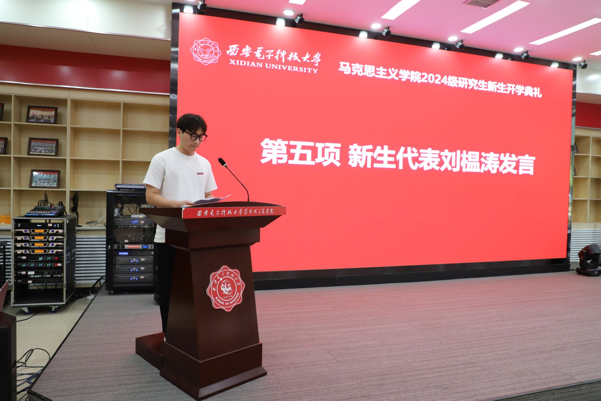 刘榅涛同学代表全体新生发言,他表达了对学校的憧憬和对学术研究的热情,承诺将像无数西电前辈一样不负韶华,努力学习,在强国建设和民族复兴伟业中不畏艰难,勇于拼搏,彰显担当。
