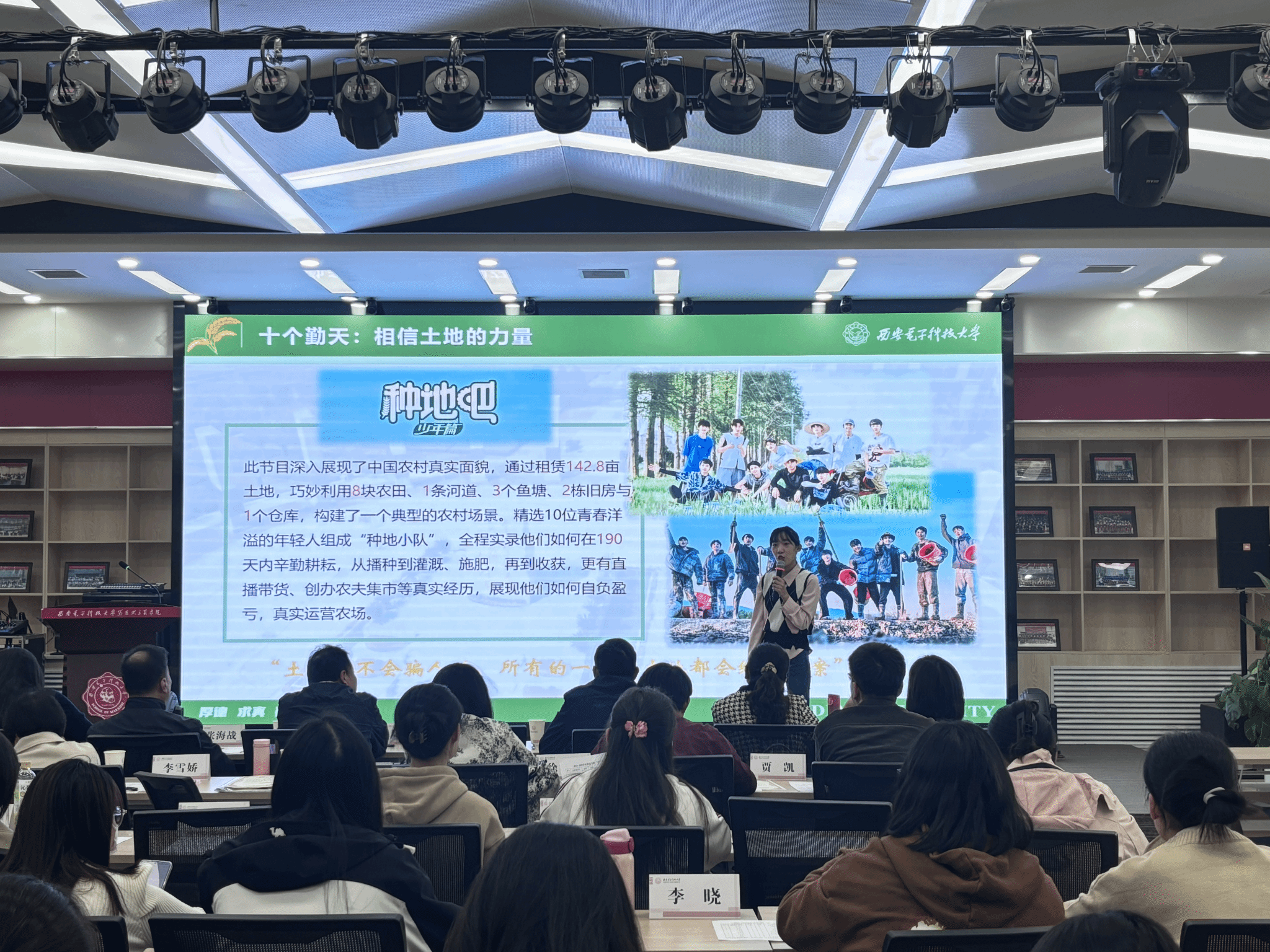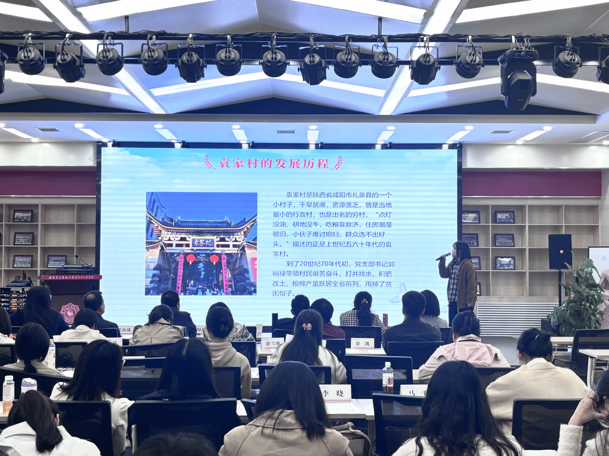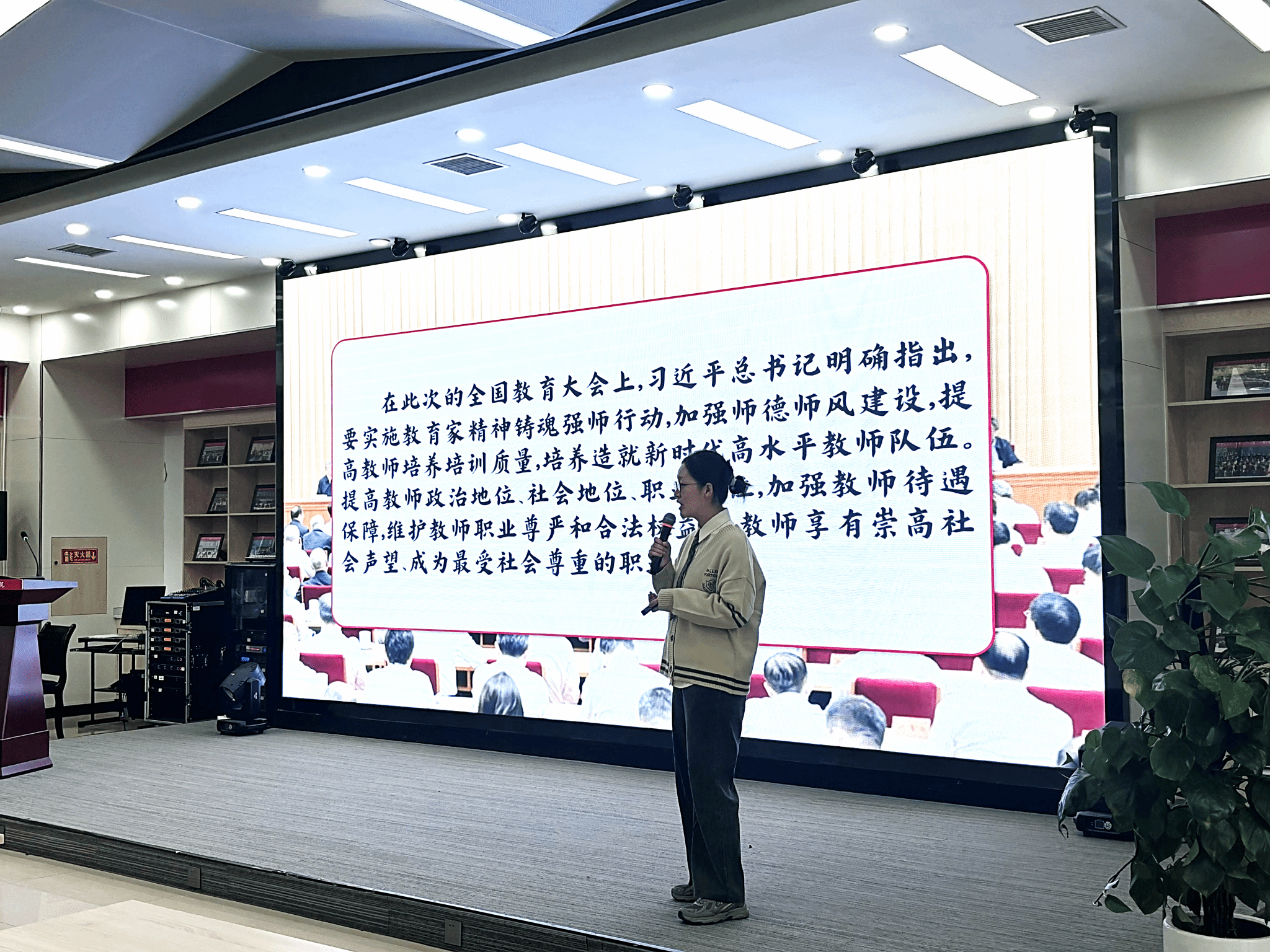 “青”声“习”语研究生宣讲团成员张羽、马一聪、李晓三位同学进行了宣讲展示。张羽同学以“弘扬教育家精神,勇担教育强国使命”为主题,围绕陶行知、叶圣陶的事迹讲述教育家精神,带领大家深入学习习近平总书记在全国教育大会上的指示。马一聪同学则围绕“民族要复兴,乡村必振兴”的主题,分享了乡村振兴的成功案例和展望,以袁家村的发展历程为例,号召大家积极投身乡村振兴的伟大实践。李晓同学以乡村振兴中青年的责任为切入点,结合党的二十届三中全会中关于乡村振兴的重要决定,呼吁新时代青年勇于担当,走好振兴之路。三位同学以生动的语言、感人的故事和深刻的思考,获得了在场师生的阵阵掌声。