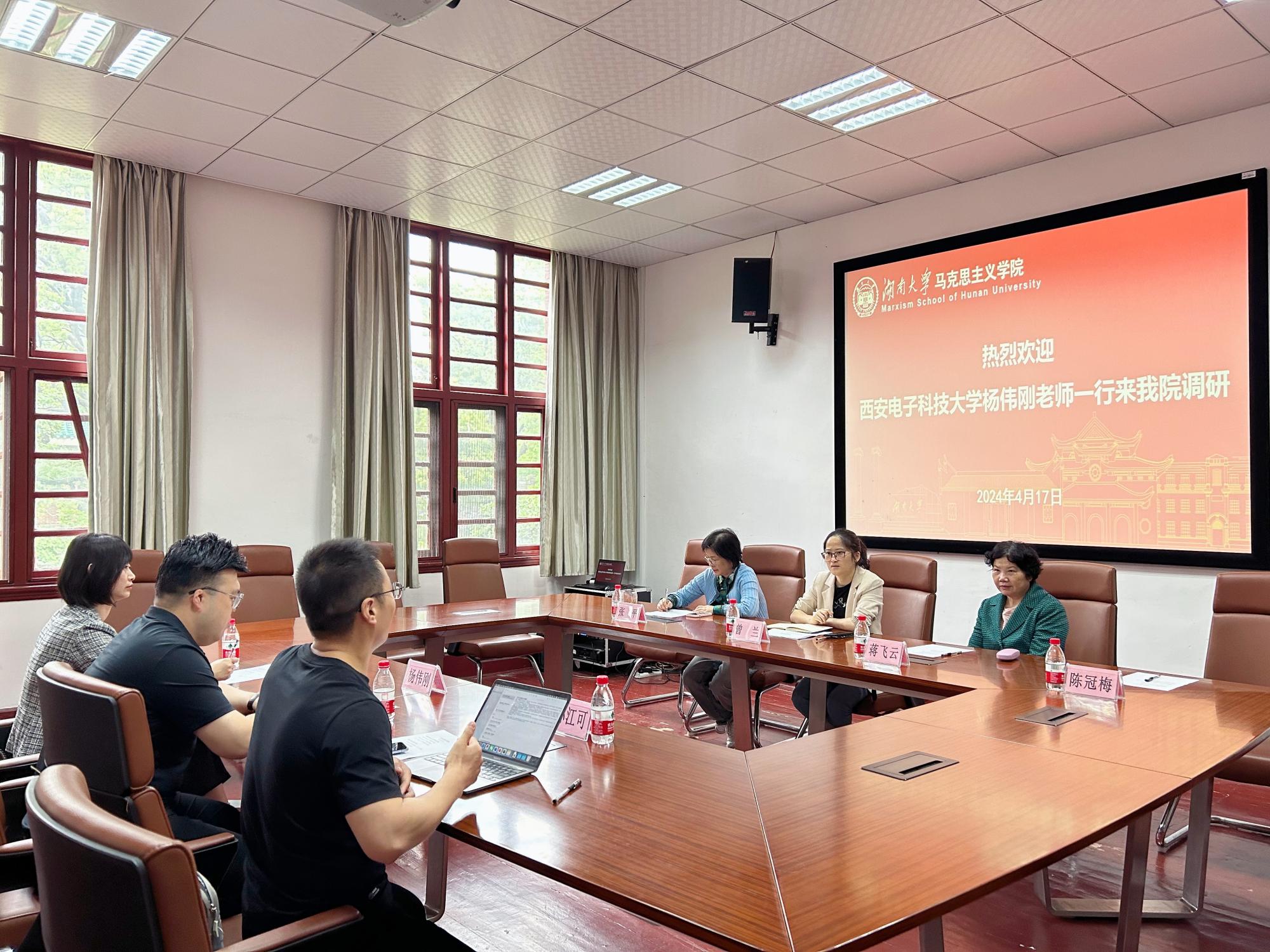 曾兰对西电马院教师一行表示欢迎并介绍了湖南大学马院的师资队伍和人才培养,以及学院思想道德与法治课程、思想政治理论课和学院重点支持的移动思政课的建设情况,并详细介绍了湖南省思政公开课的机制建设。她表示,希望加强与西电马院的联系,开展跨地区兄弟高校马院间的集体备课活动,相互交流经验、共享精品案例。杨伟刚对湖南大学马院的热情接待表达了感谢,就西电马院关于教师培养和课程建设情况做了充分介绍,孙江可重点分享了西电马院思政第二课堂的开展情况,高宇璇介绍了学院“五位一体”课程改革情况。