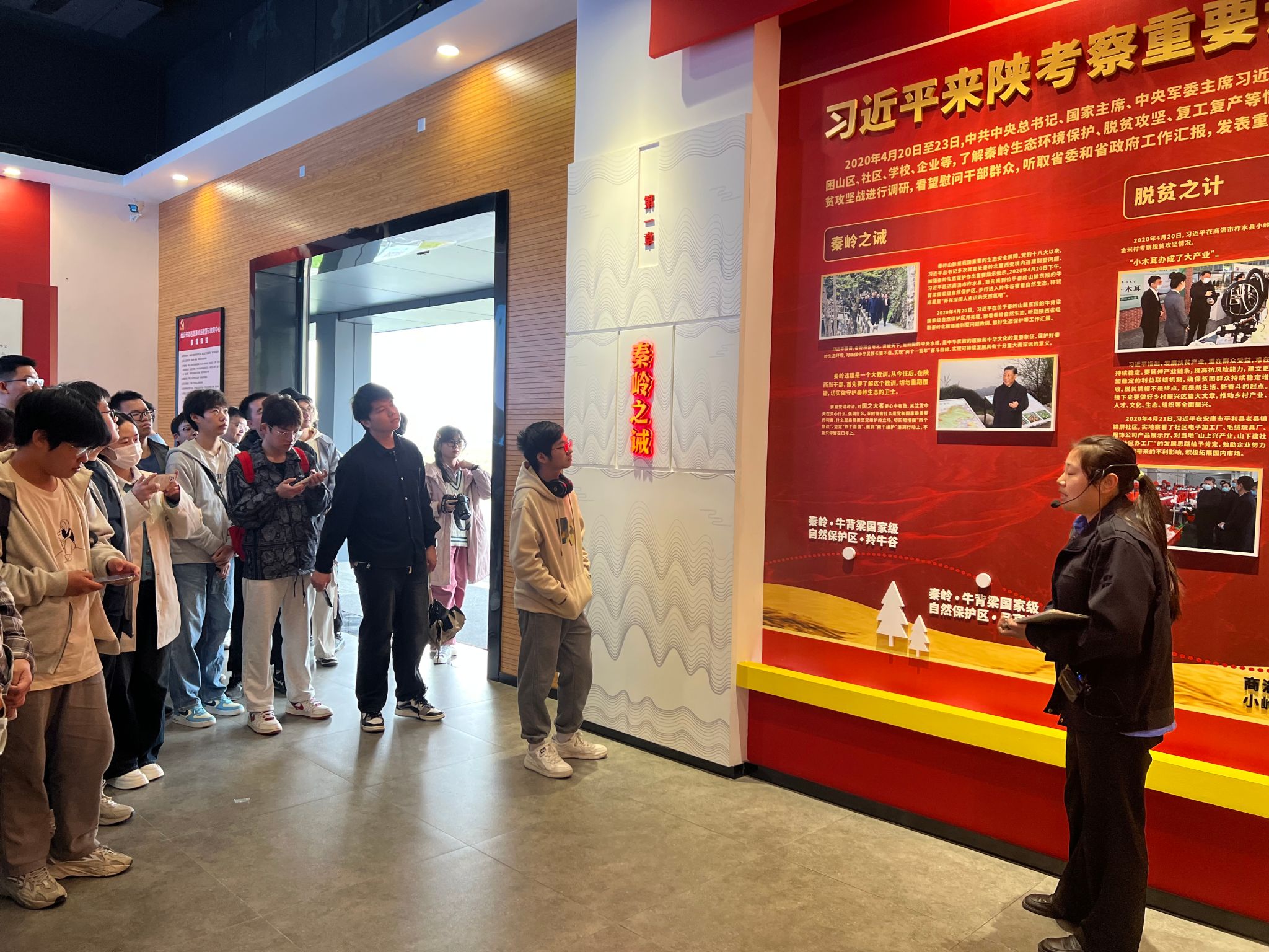 首先,师生们跟随讲解员逐一参观了五个主题展厅,包括“秦岭之诫”、“秦岭之殇”、“秦岭之治”、“以案示警”和“大美秦岭”。在参观过程中,大家学习了习近平总书记在陕西考察期间对秦岭生态保护的重要指示精神,并深入了解了秦岭北麓违建别墅问题的整治工作情况,以及过去对秦岭的生态修复的进展和成效,对秦岭北麓的生态修复成果有了全面的认知和把握。