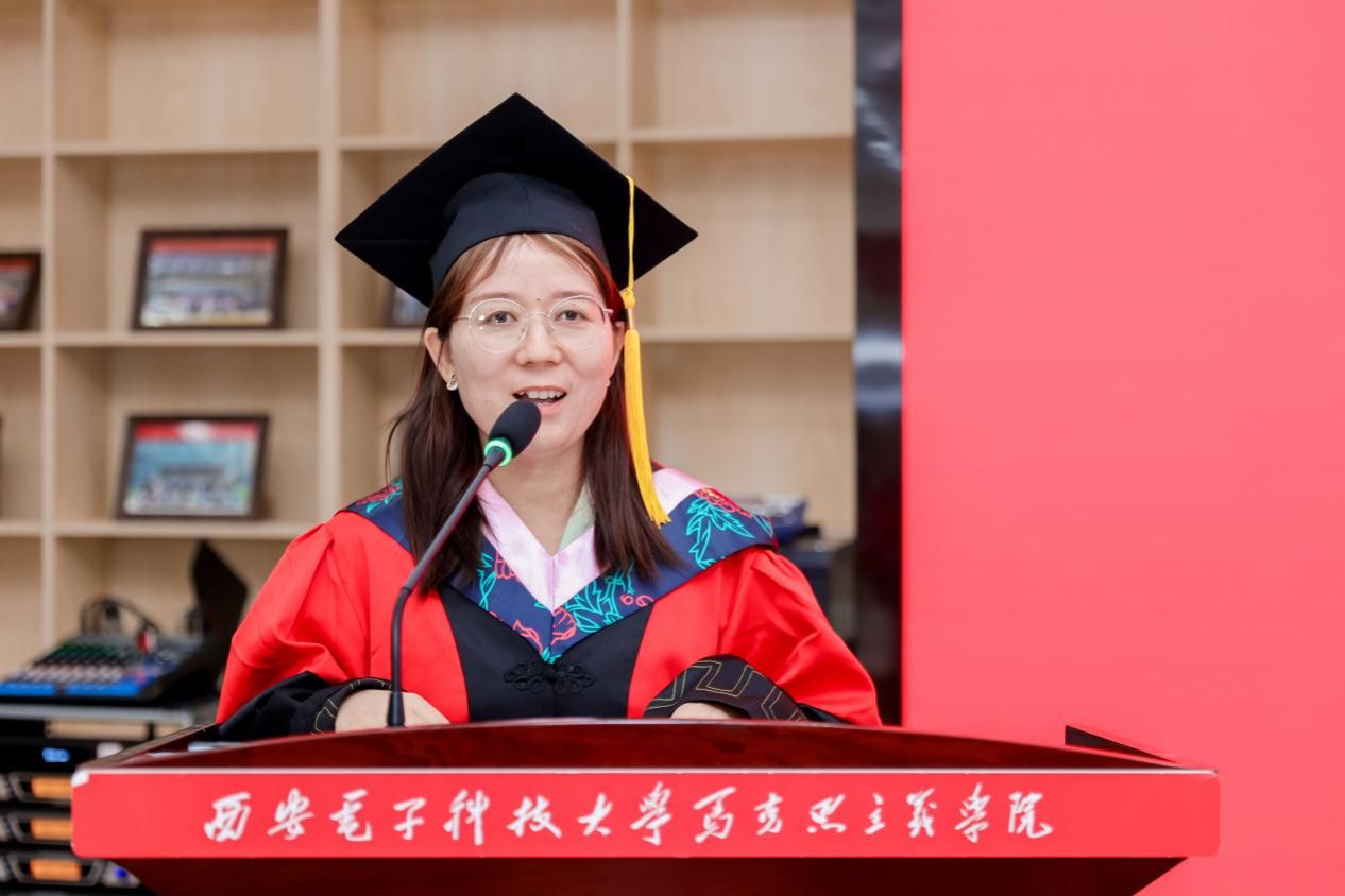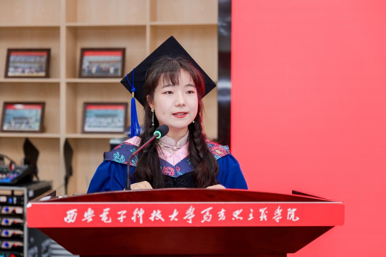 接着,2022级硕士生冯雪薇作为毕业生代表发言。她回顾了在马院三年的求学时光,感恩师长的悉心栽培和同窗的携手同行,并号召同学们牢记西电马院人的身份,将马克思主义理论与实践结合,讲好中国故事,在新时代征程中贡献青春力量。
