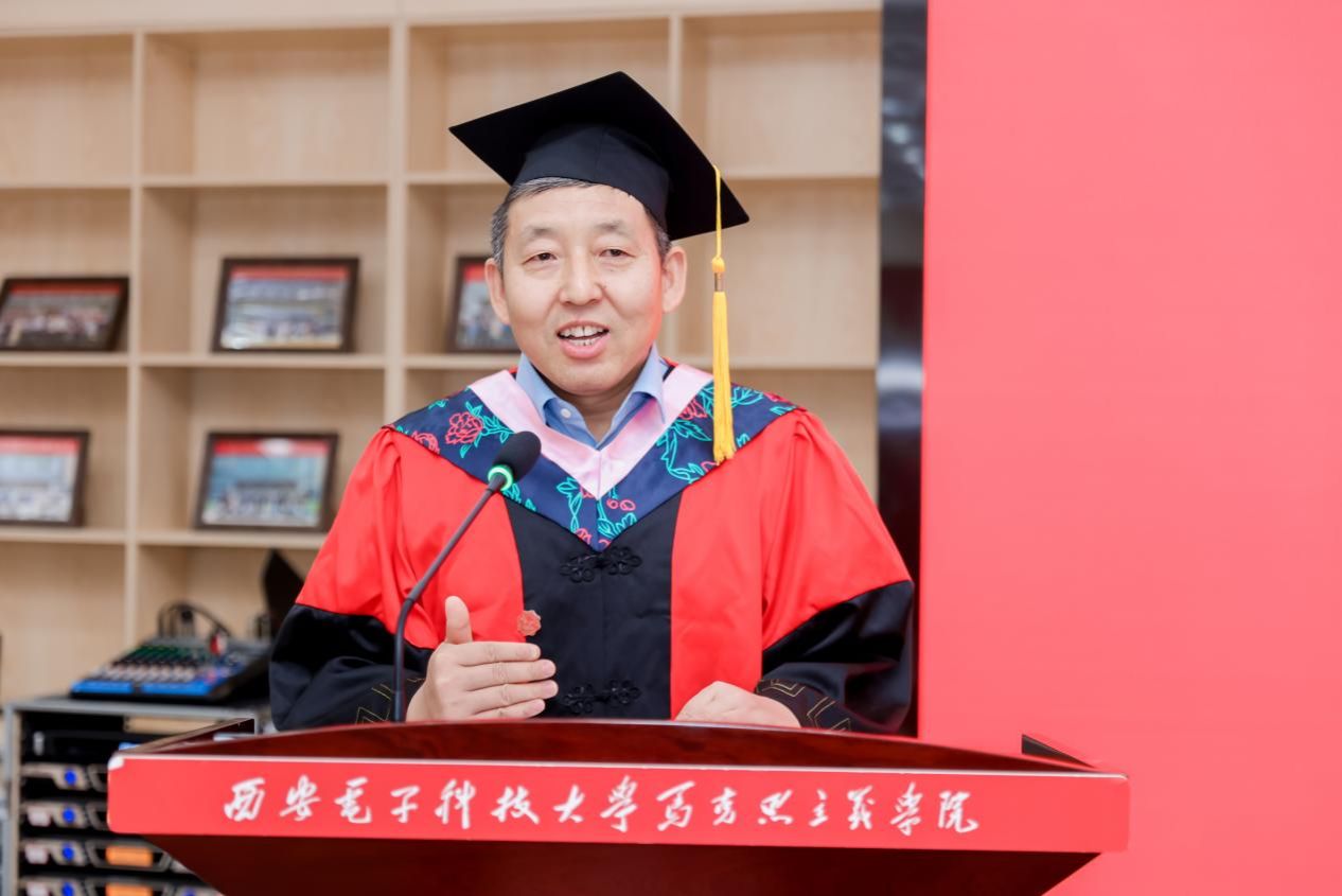 毕业典礼伴随着庄严的国歌声正式开始。学院副院长刘建伟代表学院致辞,向全体毕业生致以热烈祝贺,并向悉心培养学生的导师们表达诚挚感谢与崇高敬意。刘建伟副院长以苏轼诗词为引,结合马克思主义辩证法,对毕业生提出三点殷切期望:一是要把握时代机遇,以“新火试新茶”的进取精神勇立潮头;二是要以“一蓑烟雨任平生”的豁达心态迎接挑战;三是要坚持“厚积薄发”的辩证思维,科学规划人生发展。最后,他希望同学们能够永葆马克思主义者的政治本色,以实际行动践行西电马院人的使命担当,祝愿全体毕业生前程似锦、鹏程万里,在实现中华民族伟大复兴的征程中绽放青春光彩。