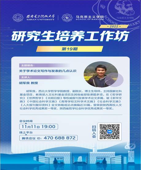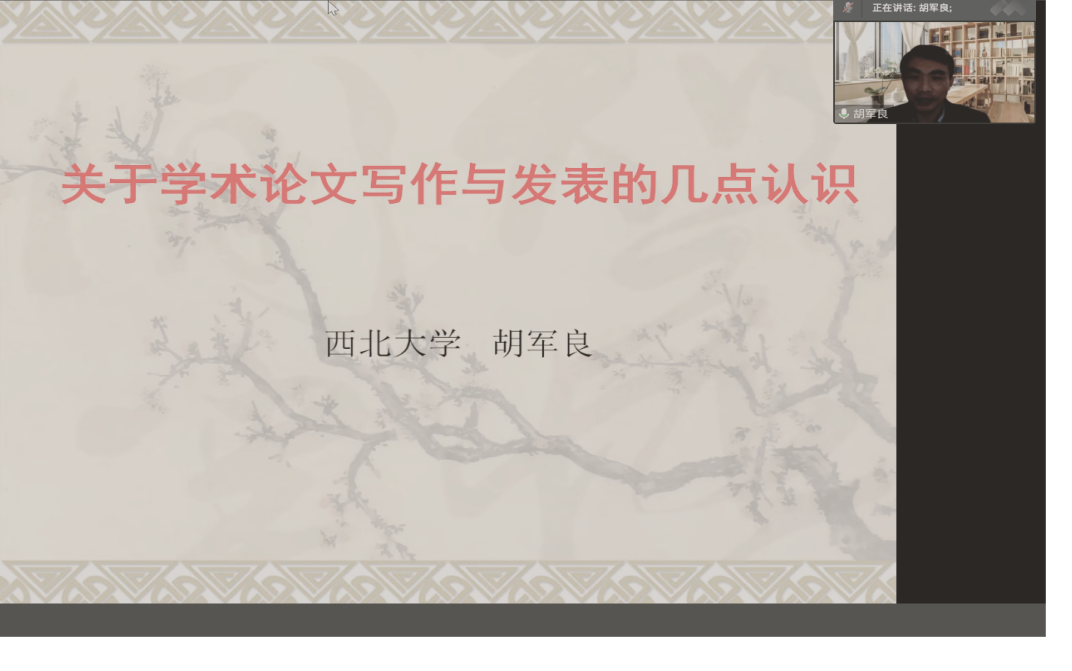 (通讯员 白丹 冷春春)11月11日,yl6809永利顺利举办第19期“研究生培养工作坊”学术沙龙活动。本次沙龙邀请到西北大学哲学学院副院长、博士生导师胡军良教授为大家作题为“关于学术论文写作与发表的几点认识”的主题报告。活动通过线上开展,由22级研究生白丹主持。