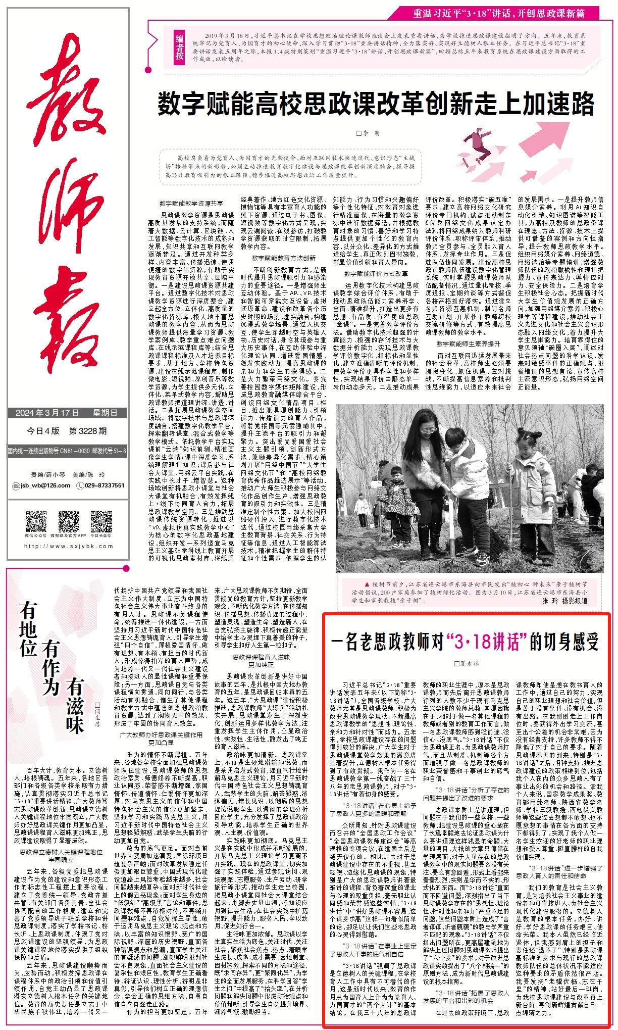 在过去的政策环境下,思政课教师即使是想在教书育人的工作中,通过自己的努力,能够实现自己的职业理想和社会价值,但是苦于没有条件、没有机会、没有出路。在我个人刚刚走上工作岗位之后,那个时候,要获得外出学习交流、甚至出个公差的机会非常难,因为没有经费支持,许多的教师不得不降低了对于自己的要求。随着思政课的春天到来,特别是“3.18”讲话之后,各种支持、推进思政课建设的政策相继到位、甚至是超量的支持,包括我个人在内的众多的思政课人有了事业出彩的机会和路径。拿我个人来说,国家教学成果奖、教育部网络名师、陕西省教学名师、学校三级教授、西电最美教师等等这些过去想的不敢想、也不愿意想的事情在各方面的支持下都得到了,实现了我个人做一名学生欢迎的好老师的职业理想和受人尊重、挺直腰杆的自我价值为实现。没有“3.18”讲话及后来的系列政策,一切都是不可能的。
