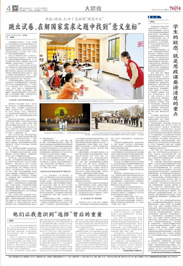 这种跨学科碰撞,正在全国多所高校发生。邱雷的主要研究领域是飞行器结构健康监测,他曾作为核心骨干参与具有“航空”“航天”“民航”三航特色的“大思政课”。比如,面向该校全体本科生开设的“强国逐梦·大师引航”系列前沿课程,由院士、杰青、名师、行业总师等国家级人才领衔授课,通过“大师-大课”的形式,先后邀请C919大型客机总设计师、北斗三号卫星总设计师等分享成长成才、艰苦奋斗历程。去年暑假,yl6809永利千余名本硕博学生深入全国军工重点单位、秦岭山水乡村、新疆生产建设兵团等地,了解行业发展脉络,明确行业需求与自身能力匹配度。