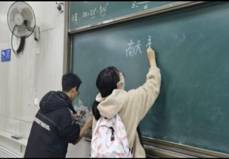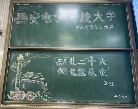 整个微视频展示课从组织、主持、设计、评委、板报、摄影等全部由学生们承担。因为课程是在上午34节进行,负责黑板报的夏志颖同学一下课就奔向该教室,另一位负责写字的马蕾同学连书包都没顾上放下就拿起粉笔,眼看时间不多了,另三位女生也奔到讲台一起帮忙。负责拍摄的杨墨墨同学迅速拍下这些动人精彩瞬间,课代表胡海洲同学随后组建团队创作出德法30班微视频展示课的微视频作品。