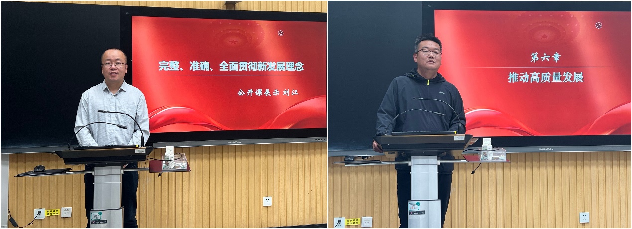 根据马院集体备课标准,刘江、时鹏先向课程组提交了“推动经济高质量发展”这一章的完整教学设计,请课程组评议;然后分别进行10分钟的说课环节和20分钟的讲课环节,讲课是在本章内选择一个教学点,开展完整的教学环节,体现教学设计。最后经过课程组集体评议,两位教师又分别进行了教学反思,形成完整的一堂思政公开课。