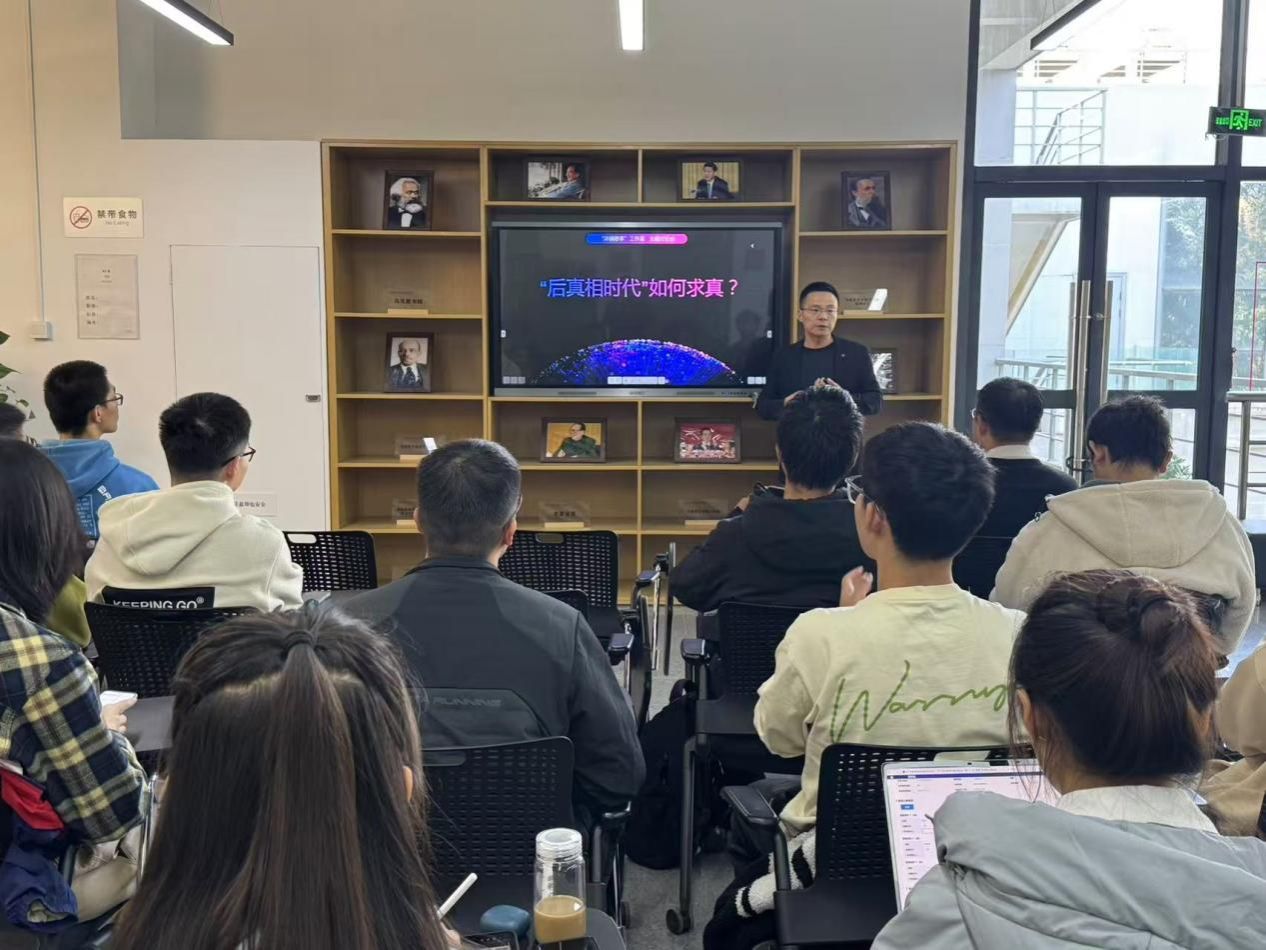 蒋冬双老师最后总结道:在后真相时代,信息繁杂,求真变得尤为关键。马克思主义理论学习为我们提供了科学的世界观和方法论,指导我们如何在纷繁复杂的信息中辨别真伪。通过培养批判性思维,我们能够更好地筛选和处理信息,从而在海量数据中把握事实真相。同时,实践是检验真理的唯一标准,我们应积极参与社会实践,从实际出发,不断探索和发现真理。在这个充满挑战的时代,坚持科学的理论学习和实践探索,是我们明辨是非、追求真理的必由之路。