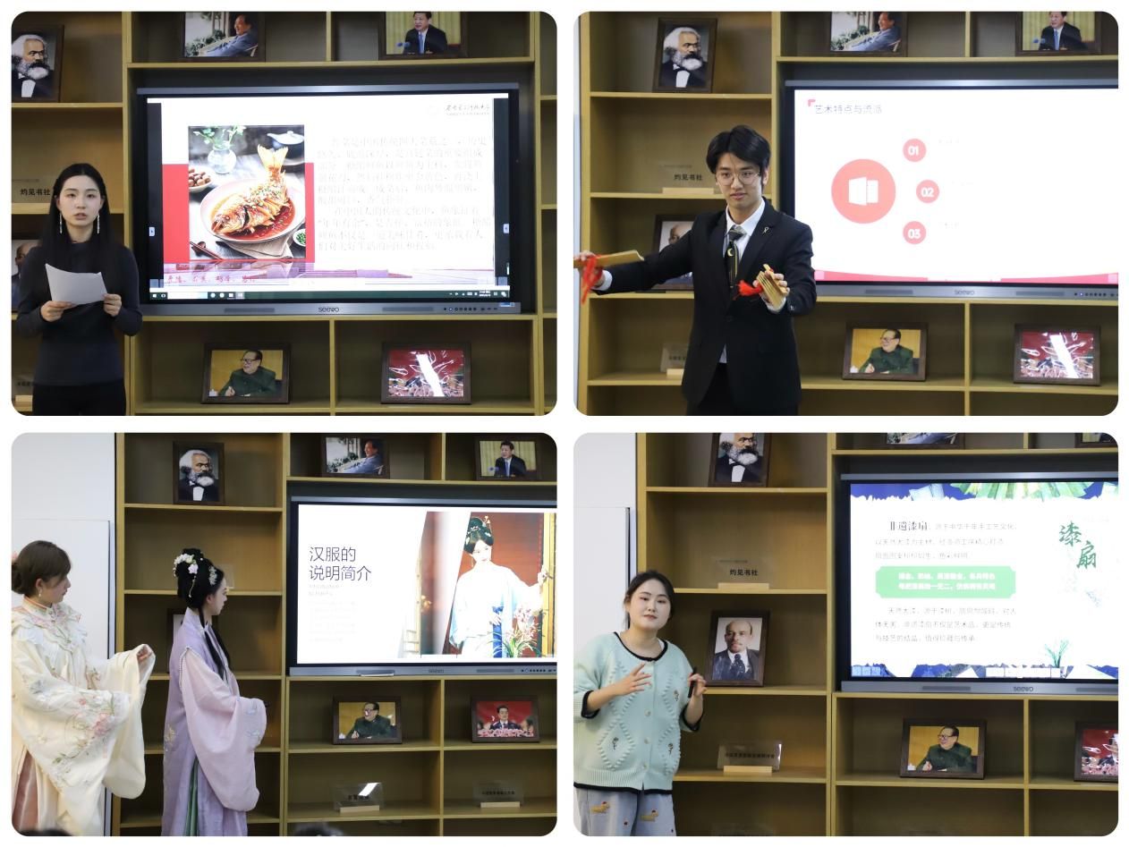 接着,由中国学生对中华优秀传统文化进行展示。汉服社成员身着款式多样的精美汉服,以专业的讲解向大家详细介绍了汉服的历史演变、独特的款式以及严谨的穿着礼仪;非物质文化遗产传承人杨子琦同学带来的快板表演,节奏明快、内容丰富,展现了中华优秀传统文化的深厚功底与独特魅力;马院灼见书社成员通过精心准备的图片与视频向大家展示了中国八大菜系以及背后蕴含的文化内涵,进一步加深了同学们对中华饮食文化博大精深的理解。