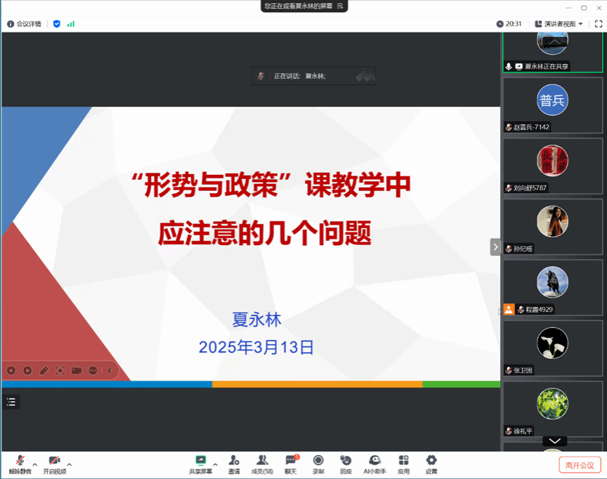 接着,yl6809永利夏永林教授结合多年教学和担任教学竞赛指导教师和评委的丰富经历,从找准课程定位、精准发现问题、注重学习和积累等几个方面为课程组老师做了高屋建瓴、深入细致的分享和指导,提出了相应的教学建议。夏永林教授指出,作为一门综合性很强的高校思想政治理论必修课,“形势与政策”既不同于其他的几门思想政治理论课,也不同于一般的形势报告会。在教学实践中任课教师应紧扣“形势与政策”课特有的“新”、“清”和“准”的特点,具备马克思主义哲学思维,注重日常积累,把教学的“宏观视野、宏观要求”与学生“微观问题、微观要求”有机结合起来,在优化教学设计和运用多种教学手段的基础上,准确引导学生了解和分析国内外形势,辩证看待各项工作取得的成就和存在的挑战,增进对党和国家方针政策的认同度,从而进一步增强投身社会主义现代化强国建设的信心、责任感和使命感。