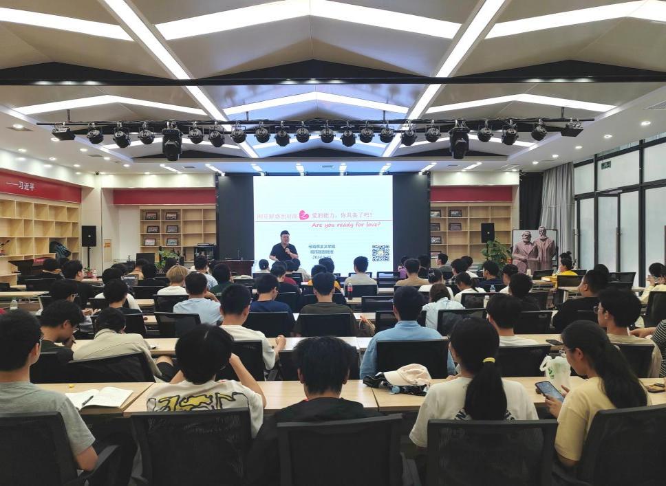 活动伊始,杨伟刚副教授首先提出问题“什么是爱?”“为何找不到恋爱的感觉?”,引发在场学生思考,并共同分析爱情中的非理性观念,探讨快节奏生活、童年生活缺失以及错误的爱情教育是如何影响爱情的纯粹与美好等问题。互动后,杨伟刚副教授以大学生的现实生活为例,用诙谐幽默的语言讲述爱情不同阶段带来的情绪价值、存在的各类误区等,鞭辟入里地对爱情进行了多元化、多角度的解读,引导大家更理性地看待爱情中的种种问题。随后,杨伟刚副教授引经据典,从艾里希•弗洛姆的观点出发,阐释了“爱”是什么,引导同学们对爱情产生更深入的思考。