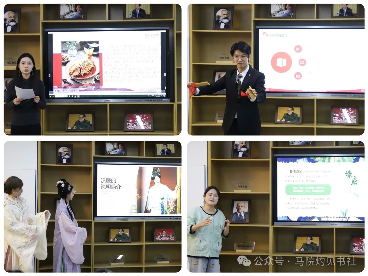 接着,由中国学生对中华优秀传统文化进行展示。汉服社成员身着款式多样的精美汉服,以专业的讲解向大家详细介绍了汉服的历史演变、独特的款式以及严谨的穿着礼仪;非物质文化遗产传承人杨子琦同学带来的快板表演,节奏明快、内容丰富,展现了中华优秀传统文化的深厚功底与独特魅力;马院灼见书社成员通过精心准备的图片与视频向大家展示了中国八大菜系以及背后蕴含的文化内涵,进一步加深了同学们对中华饮食文化博大精深的理解。